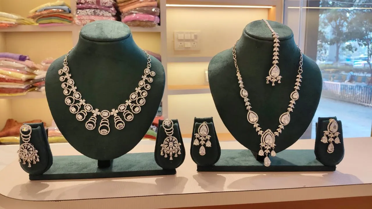 Intricately crafted diamond-style jewelry set with elegant motifs and shimmering stones—perfect for weddings and festive occasions.